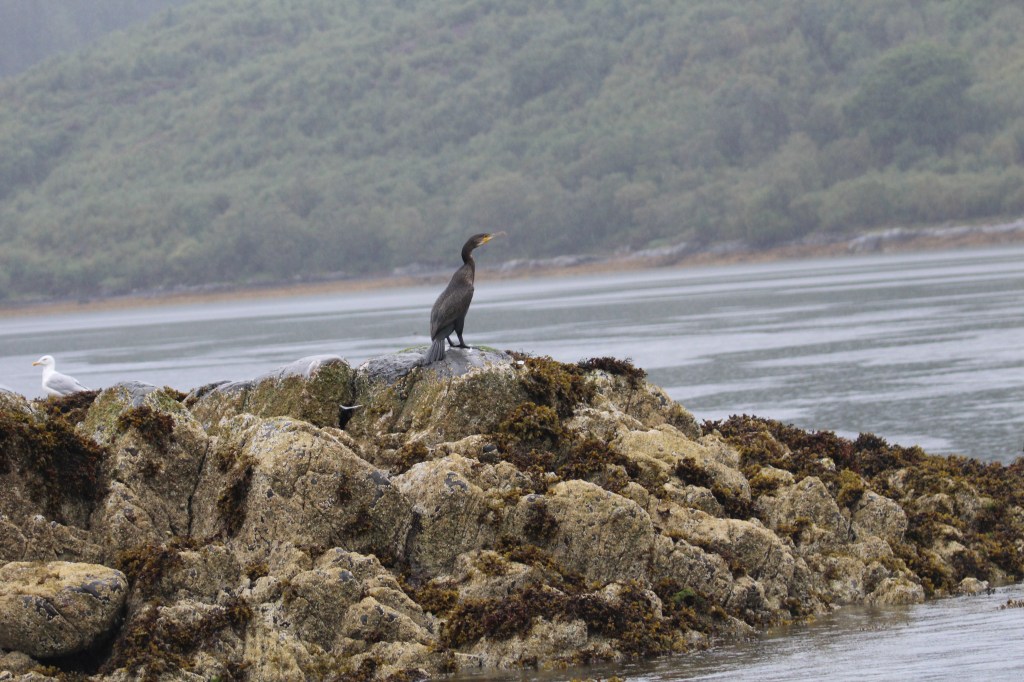 Today in the morning there was no early otter search but instead an early breakfast, so we could arrive on the boat early, before the other boats were out. Sadly the first half of the boat trip was raining, so it was quite difficult to see the ripples of otters and cetaceans. However there were cormorants and shags close to the boat, as well as goosanders and common seals.