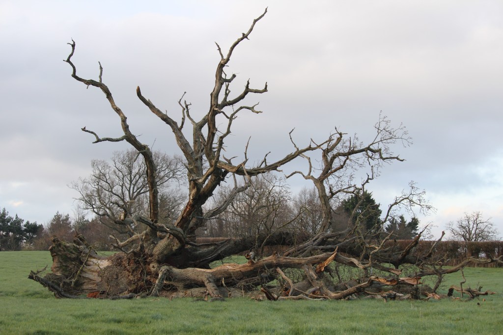 During the recent storms with strong winds and heavy rain, buildings weren’t alone in being damaged. Many large trees, some very old, have been blown over and uprooted by the extreme winds. Although wind is a natural phenomenon, areas in the lowlands that rarely experience winds have been exposed to an intensity of wind not seen in many years. In midst of all these storms an oak tree outside my home, probably a few hundred years in age, has collapsed quite dramatically in the centre of a field.