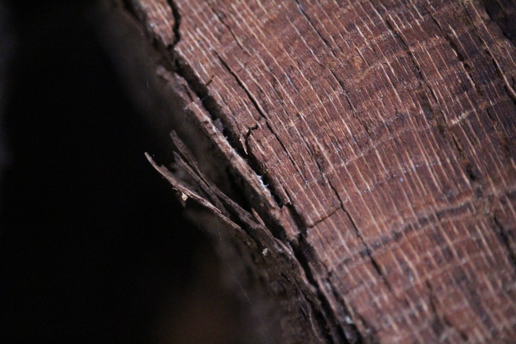 The other interesting feature I was able to see, with the tree now fallen, was the hollowing out that was occurring within the trunk unseen. Presumably, as the heartwood began to die and rot, fungi took advantage of the situation and by growing many external fruiting bodies over a number of years managed to remove quite a lot of the dead heartwood from within the tree. I noted the structure of some of the remaining heartwood was quite different the broken branches further up, and I can only assume the fungi have had an effect on this wood in some way, but this is only a guess.