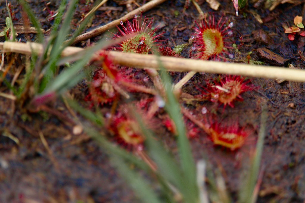 Pondering this question, I was also surprised by the strange bouncy attributes of the damp areas of peaty soil, which conveyed vibrations over large distances like an elastic material. Among the heather, one could find the bizarre “carnivorous” plants, round-leaved sundews, growing low down to the ground, which supplement their nutrition with insects much like the more charismatic Venus Flytrap. This unusual habit of the sundews is testament to the harsh growing conditions within “healthy” peat soils.